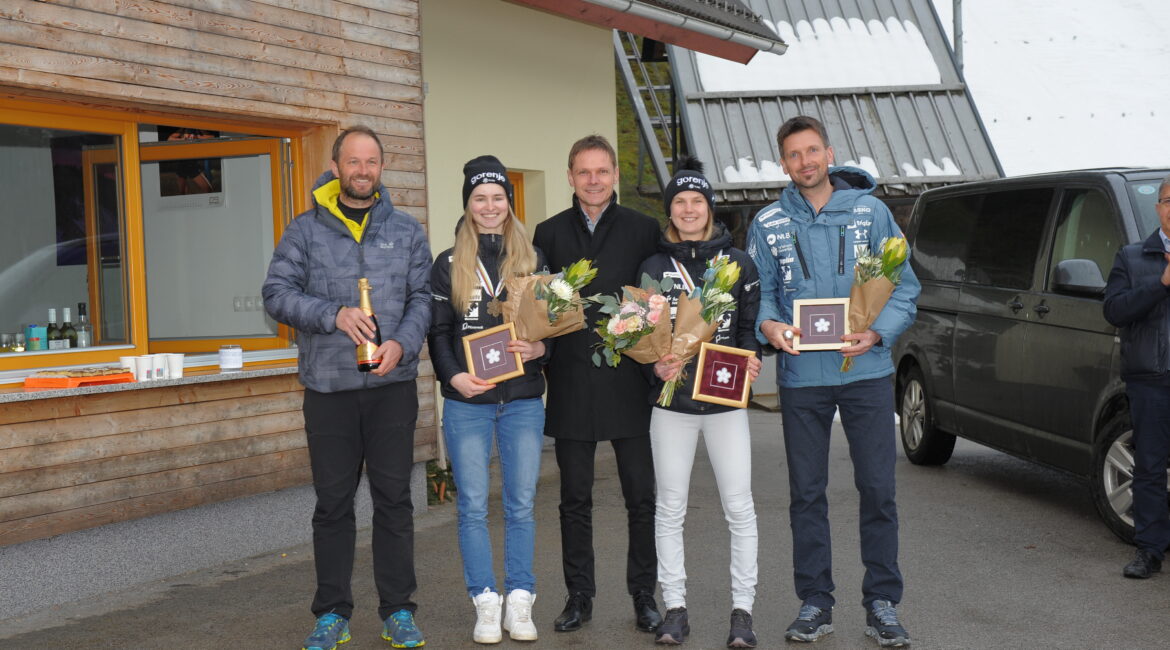 Sprejem skakalk Nike Križnar in Eme Klinec v Žireh